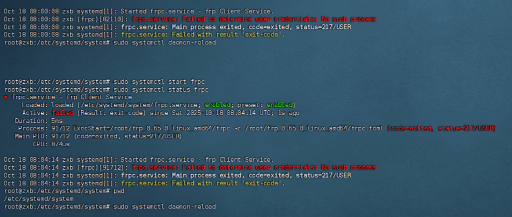 Oct 18 08:04:14 zxb (frpc)[91712]: frpc.service: Failed to determine user credentials: No such process
