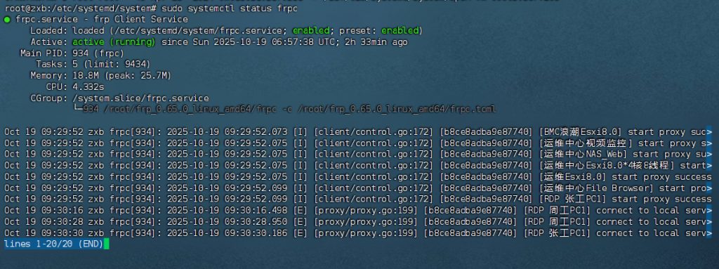 Oct 18 08:04:14 zxb systemd[1]: Started frpc.service – frp Client Service.