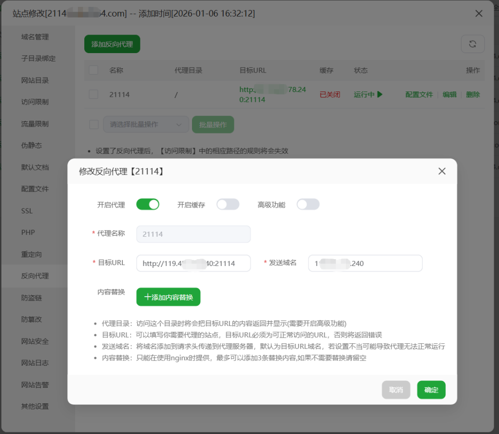 成功以后需要打开自己相应的端口21114)防火墙就可以web端访问了,在宝塔里设置反向代理,如下图: